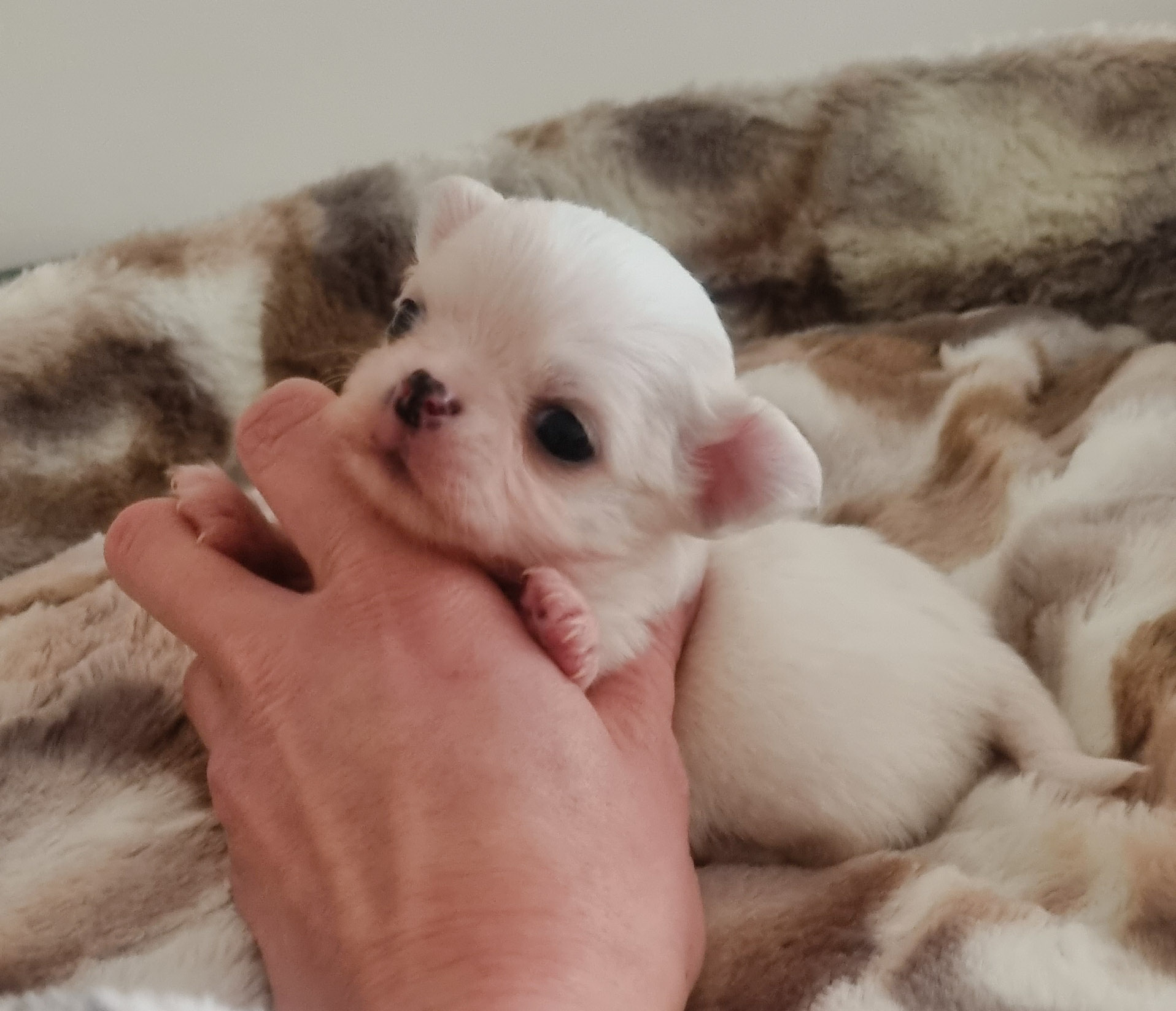 Twix, un adorable mâle à poil long de couleur blanc. Il est du très petit gabarit. Il a belle tête ronde, petites oreilles. Son corps est court et compact.